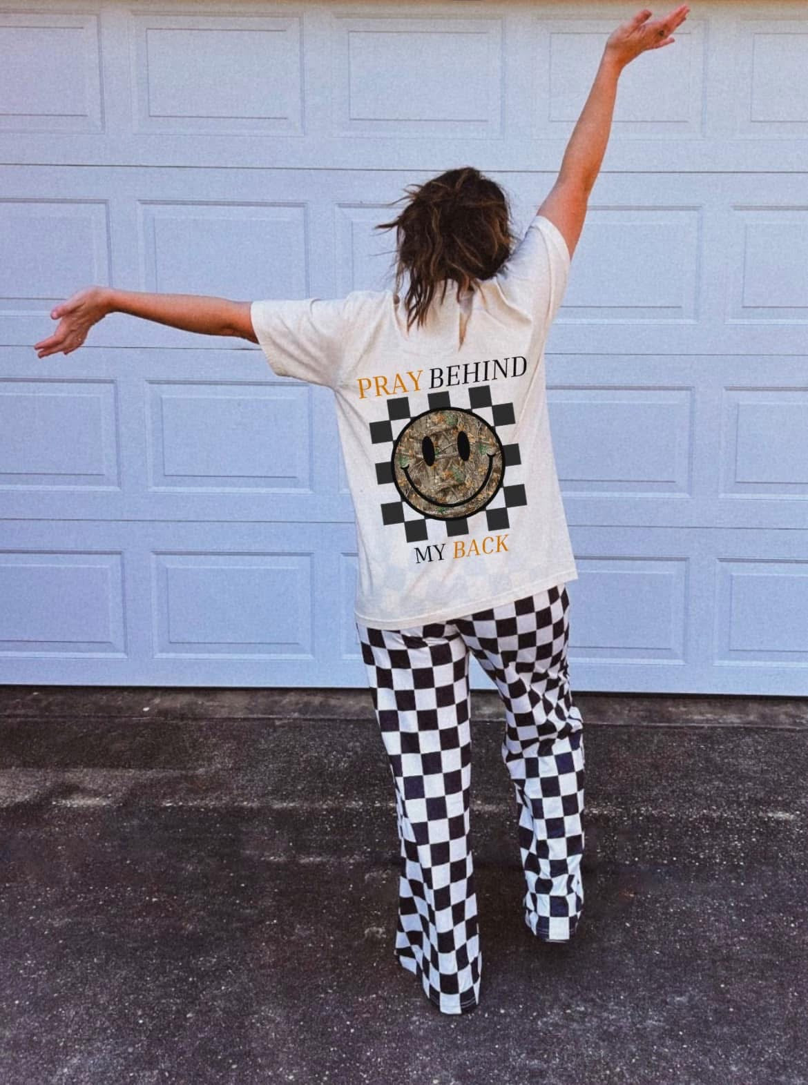 Large back print as pictured on ivory or pepper comfort color! Pepper comfort color will have lighter color print to show up best! Smallet size image on the front chest area of the camo smiley! 12/14 business day TAT. Tees are unisex with DTF prints!